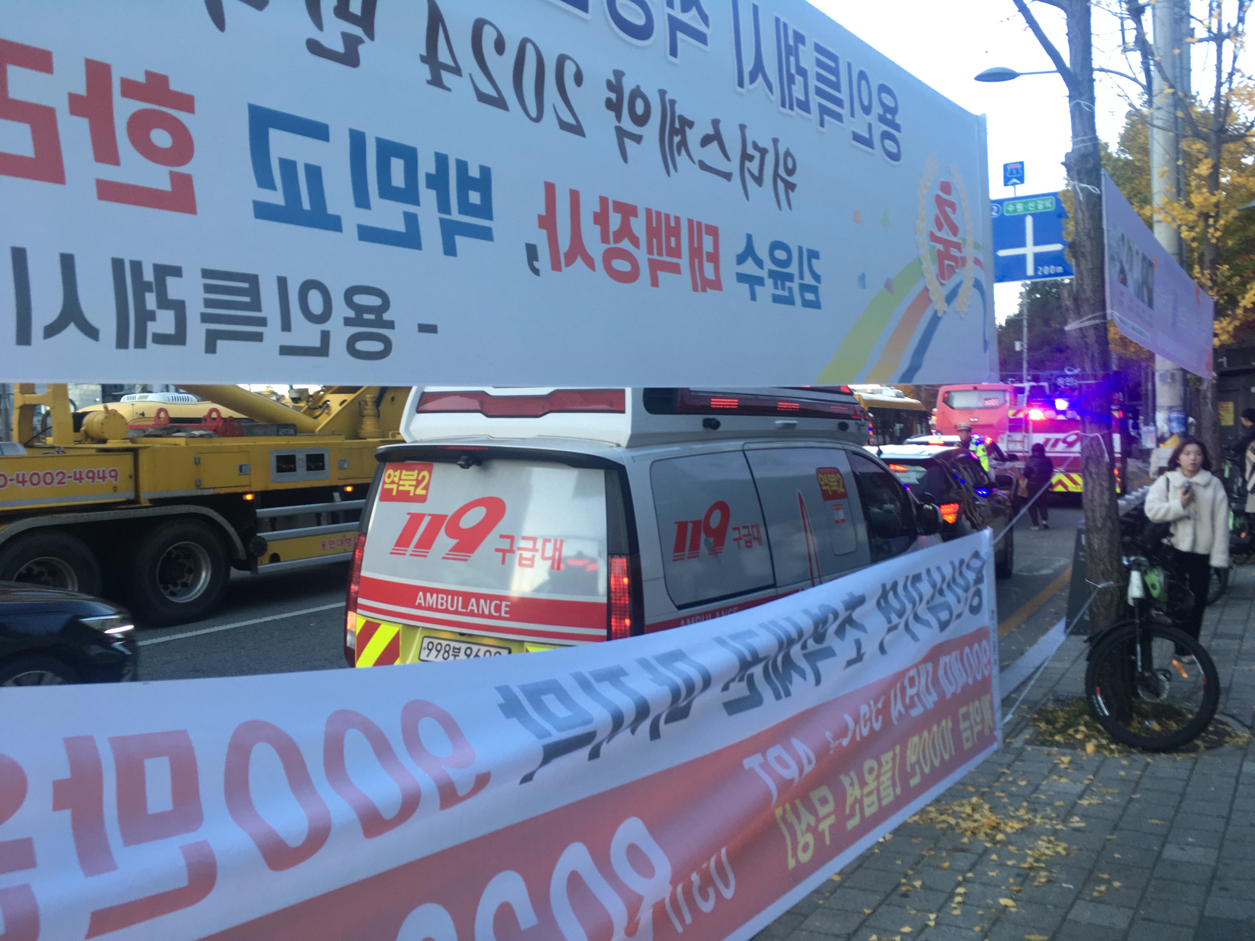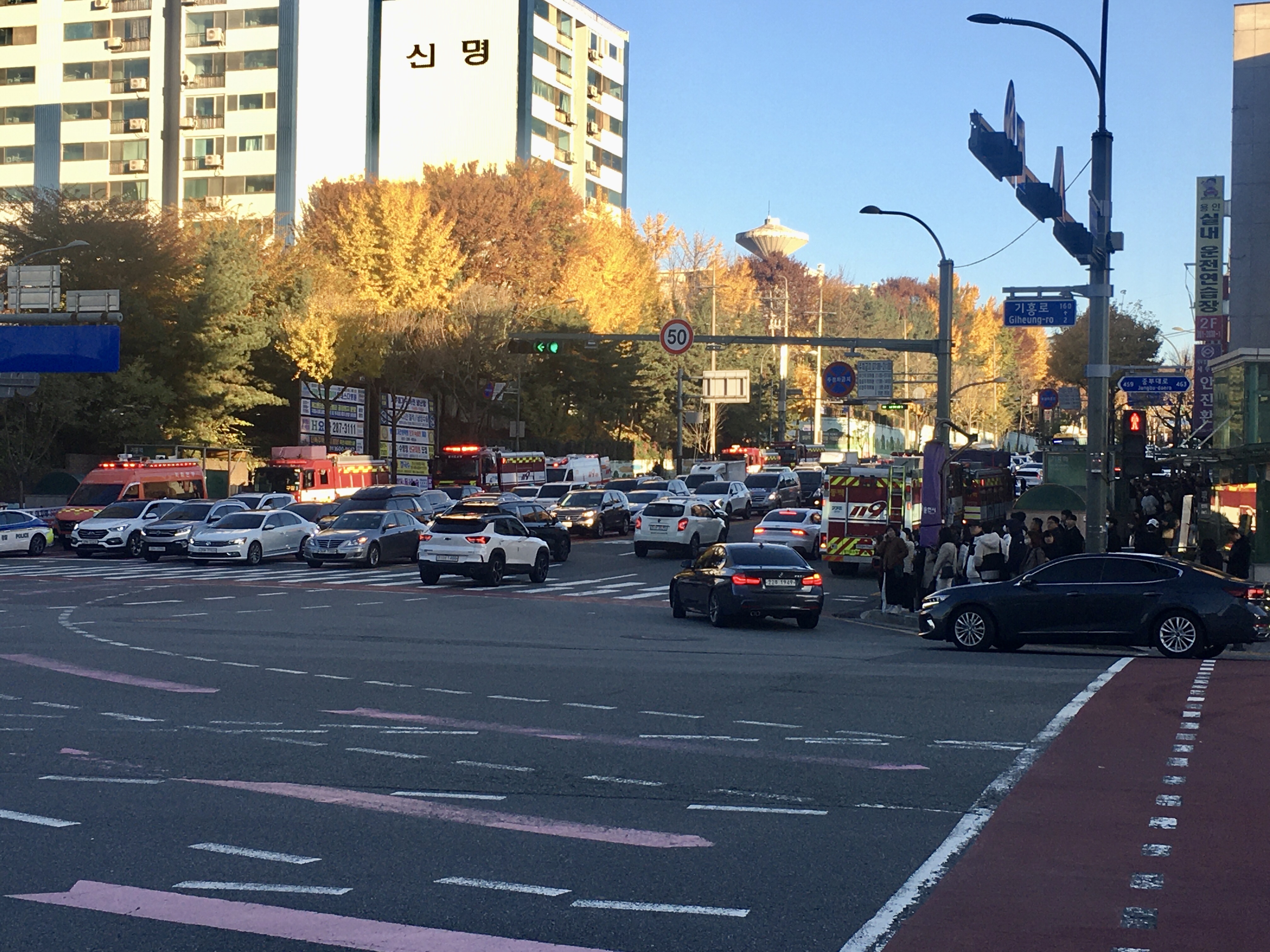 소방차와 구급차 및 경찰들이 기흥역을 통제하며 출근길 사람들에게 현 상황을 안내하고