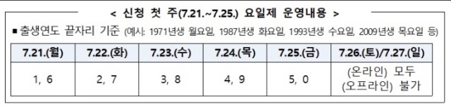신청 첫 주는 시스템 과부하를 막기 위해 출생연도 끝자리에 따른 요일제가 적용됩니다.