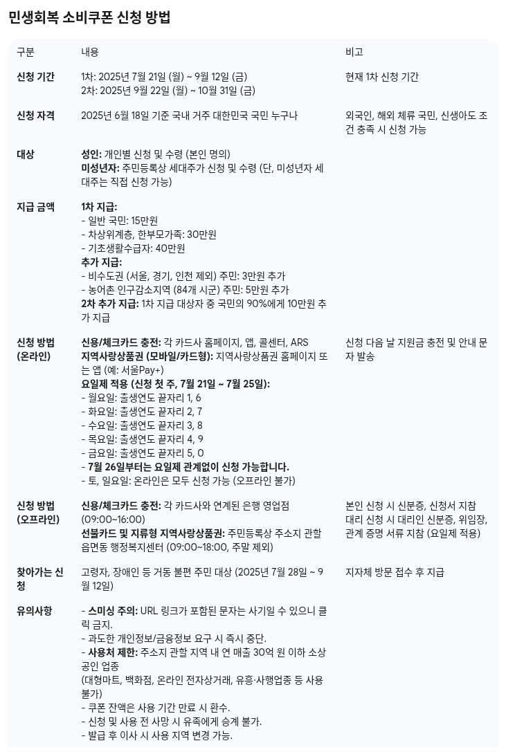 -찾아가는 신청: 고령자, 장애인 등 거동이 불편한 주민을 대상으로 2025년 7월 28일(월)부터 9월 12일(금)까지 요청 시 지자체에서 직접 방문하여 신청서를 접수하고, 지급 준비 완료 통보 후 재방문하여 지급 (선불카드)합니다.